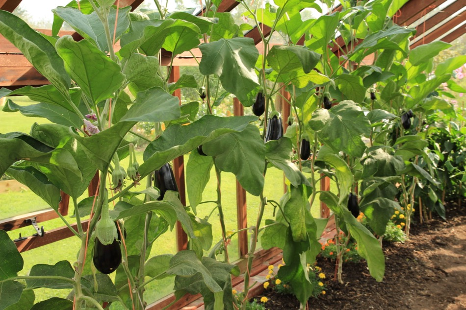 Greenhouse aubergines at September equinox, Black Pearl F1 grafted