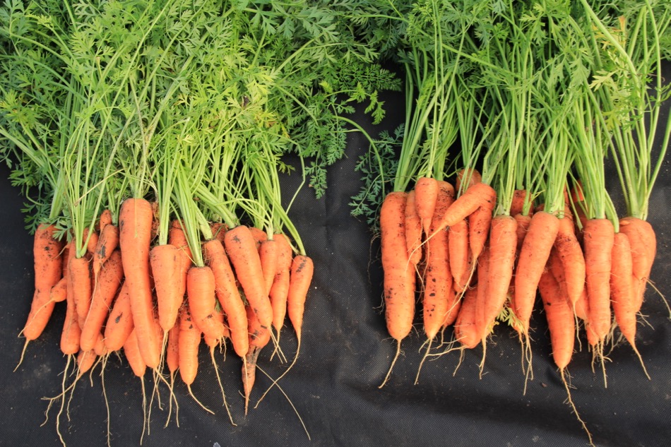 Nantes carrots sown June 6th: dug bed on left 2.2kg, undug on right 2.5kg