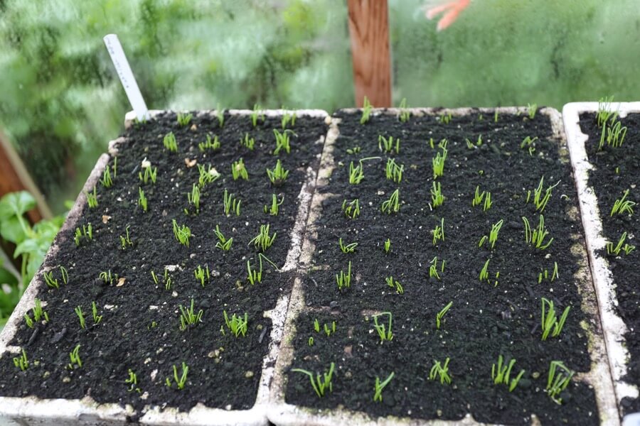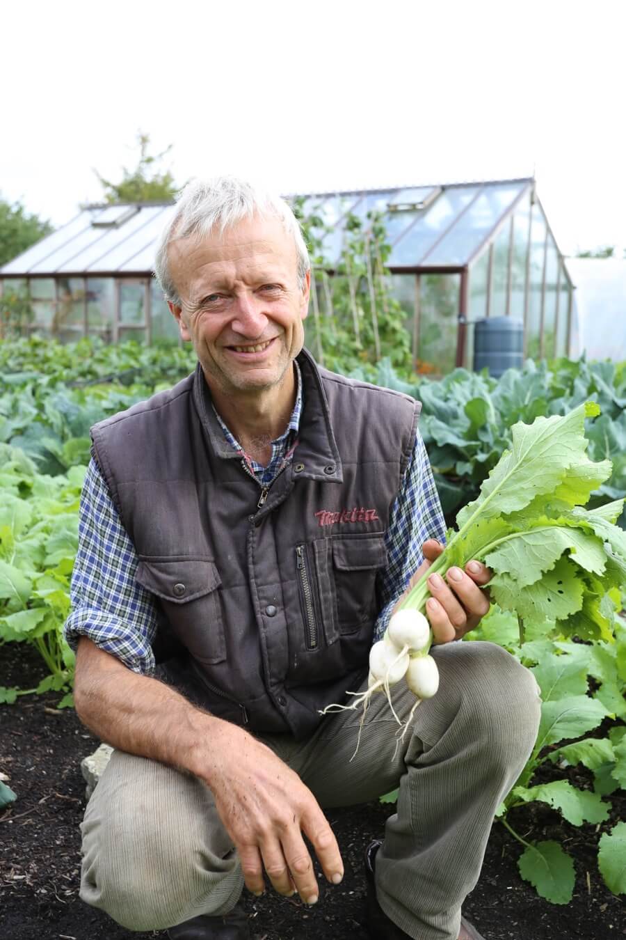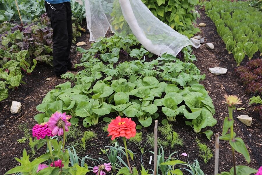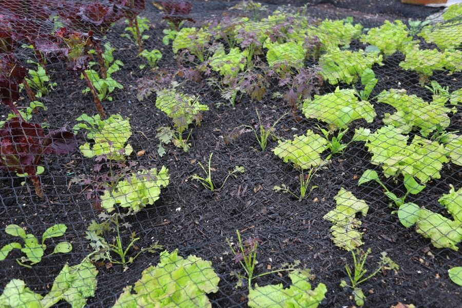 Removing mesh cover at three week stage: leeks, fennel, pak choi, kohlrabi, turnips