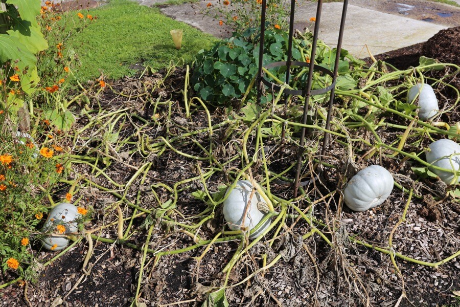 Readiness for harvest is shown by leaves dying and the squash stems going first yellow then brown. If you want to store winter squash but harvest when the stem is still juicy, put them somewhere very warm (24-30C/75-85F) so the skins harden and moisture sweats out.