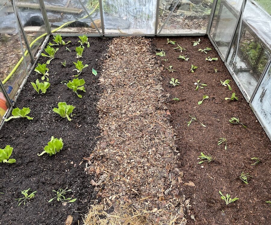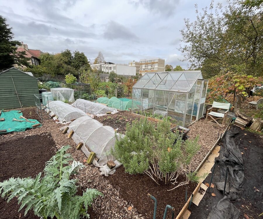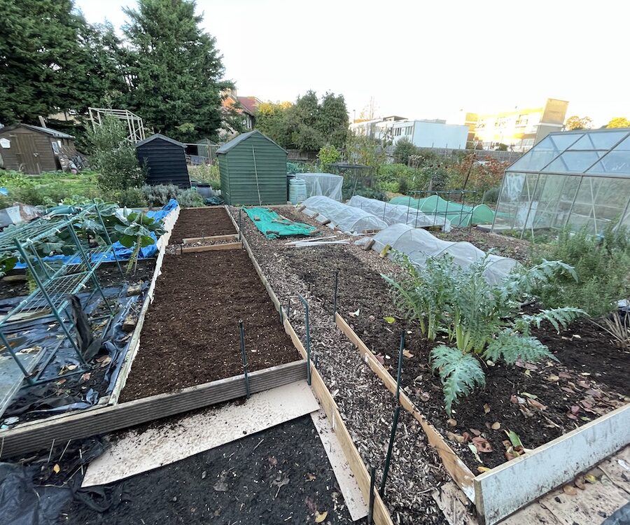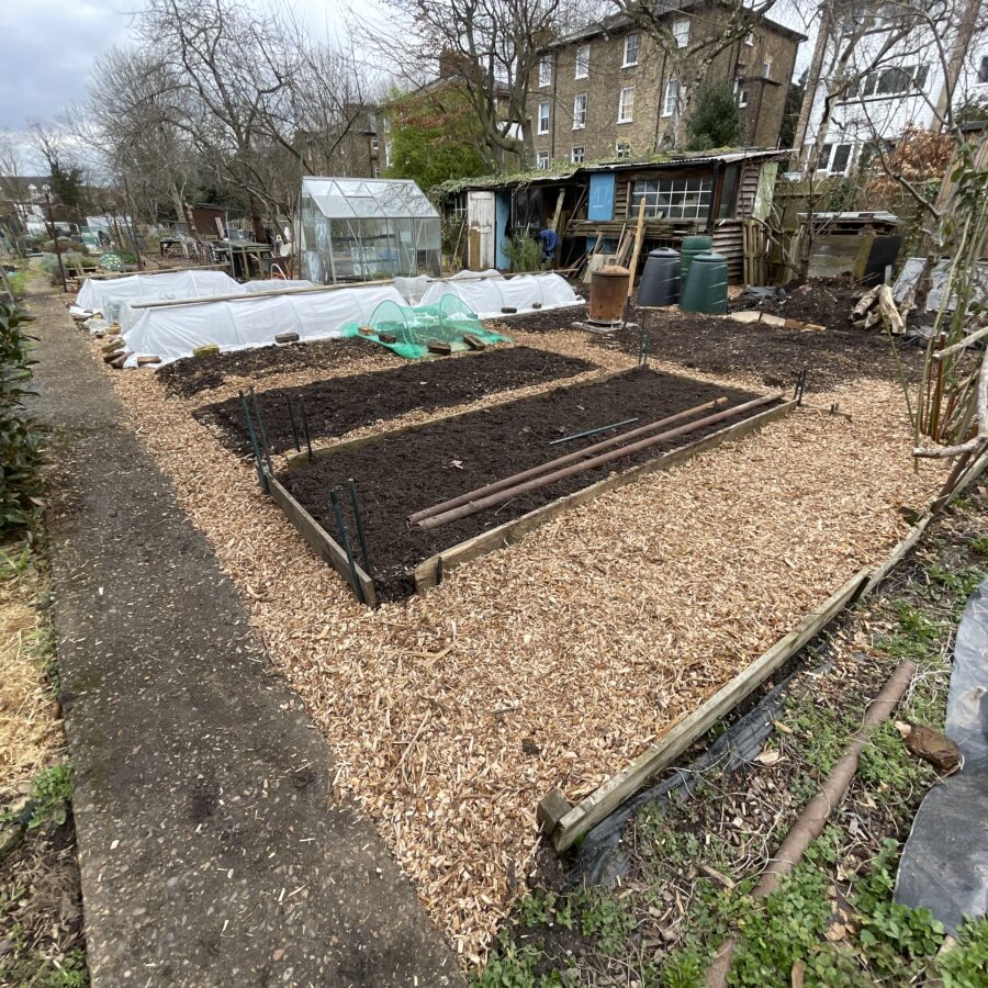 He added a small greenhouse for the winter to grow salads in, and started creating the first no dig beds shortly after that, working his way from left to right on the plot. He ordered two pallets of mushroom compost which he used to help create the beds, and is lucky to have a steady supply of wood chips which he used to create the paths.