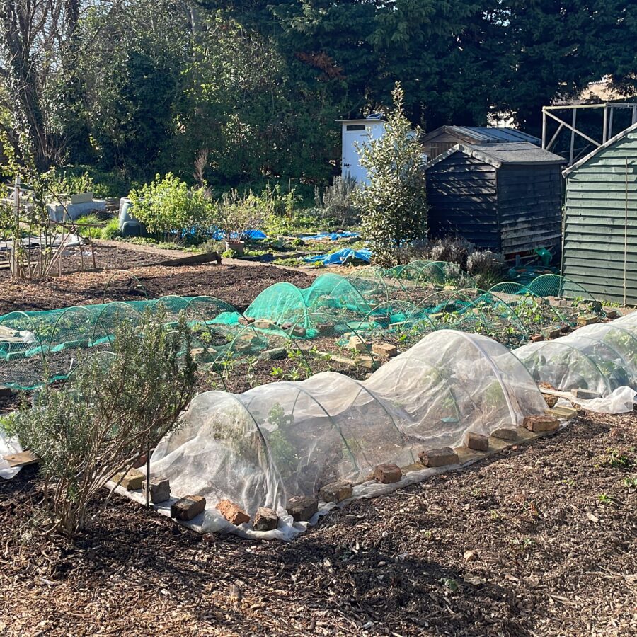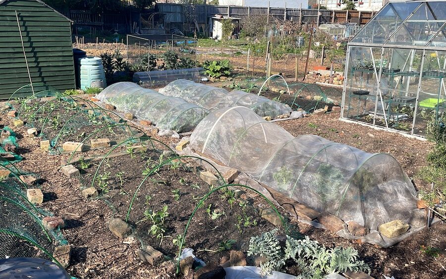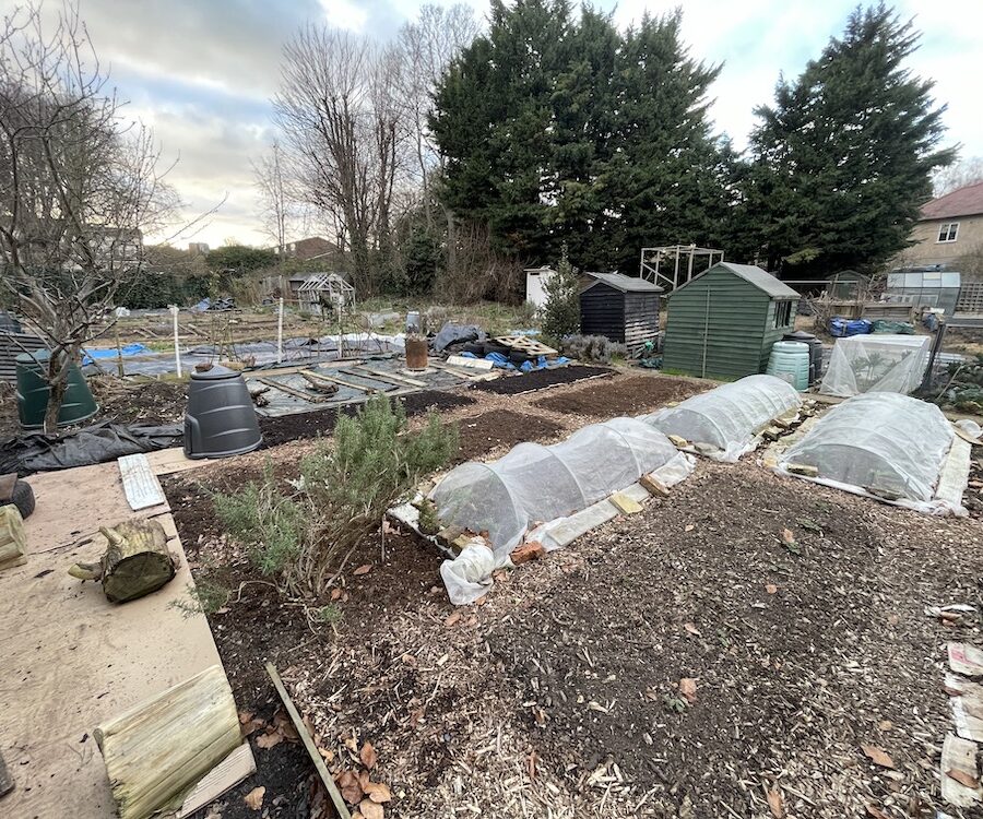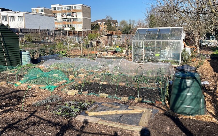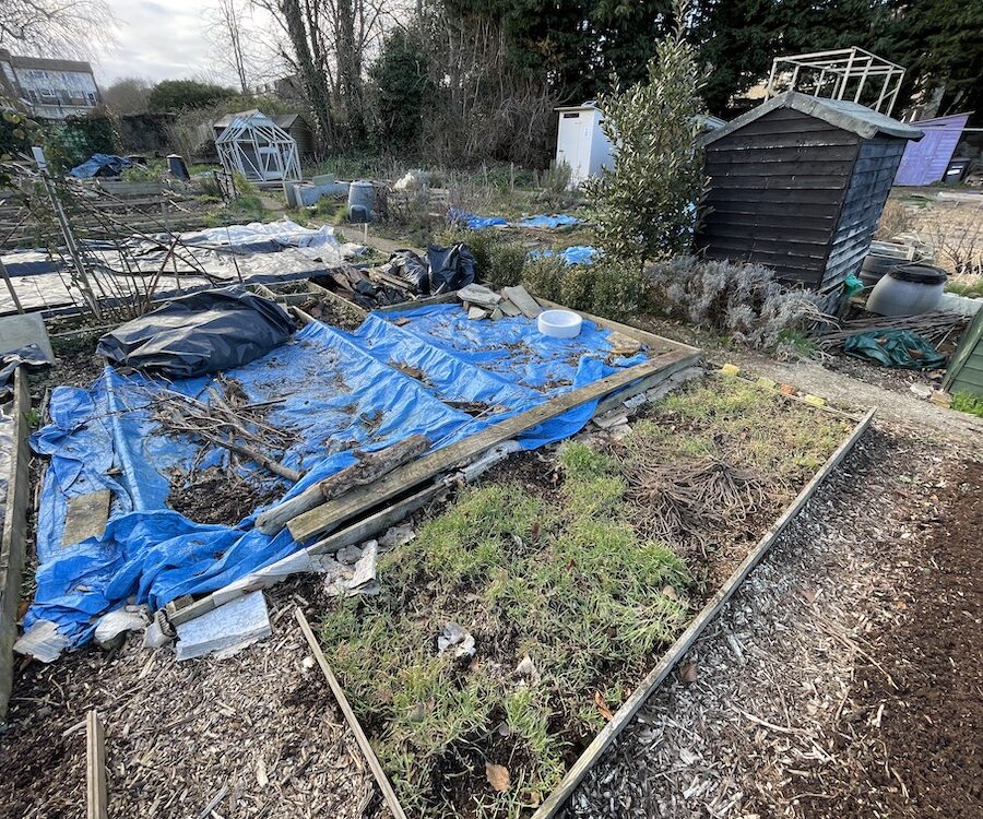 By early April 2023, Bastiaan had finished all the major groundworks and removed all the rubbish which had been left by other plot holders, and had started putting plants in the ground, including some overwintering cabbages, spinach and rocket.