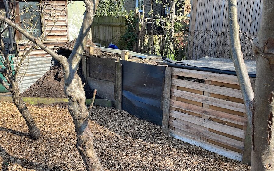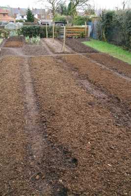 He also built three big compost bins where he sieved any soil that was taken away to make the plot more level. He had a good supply left over (weed root-free) to use later in the year (if he decides to top the beds up with that, instead of the free green waste compost they get delivered). The other compost bins are full of horse manure, which reached a healthy temperature of 70°C/158°F, breaking down well.