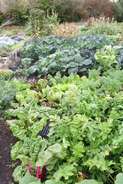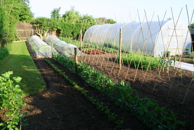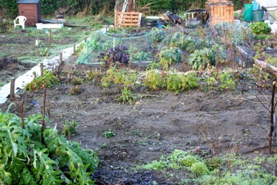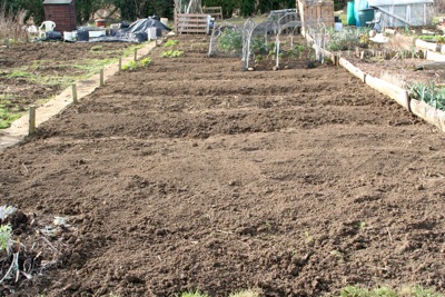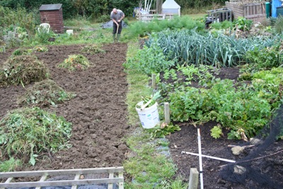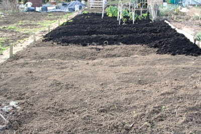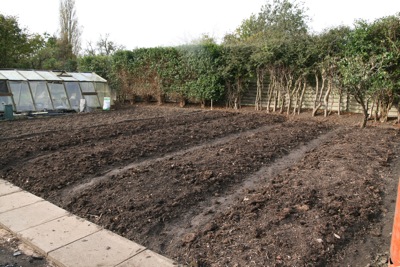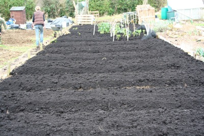 Steph no longer lives in Bruton, but this is the allotment she used to have there.Instead of digging in 2008/9, Steph spread green waste compost and some cow manure on beds that were already in place – just slightly raised soil with no wooden edges or borders of any kinds. Before that she had done a thorough weed, although many annual weeds would have been smothered by the three inch covering.The soil is heavy clay, and perennial weeds are endemic to the site – creeping tourmentil, couch grass and bindweed, but no marestail. Steph had got on top of the perennials during the two preceding seasons but was not harvesting a huge amount of vegetables, especially in autumn and winter.