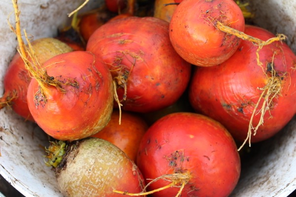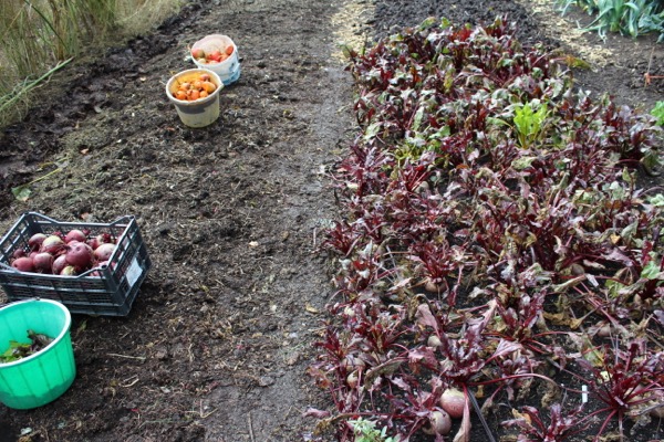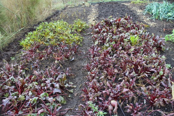 After the frost I harvested some of my remaining beetroot. A few of the golden beetroots’ leaves were singed by frost but at -3C it was not cold enough to harm the roots. On the other hand, slugs were accumulating in some of the clumps so all in all, many root vegetables are better in the barn or shed. I keep them in crates.The bed here was planted on June 29th after a last harvest of broad beans, which had been sown in mid November. It was dry at planting time and I gave some water, after that there was almost no more time needed as weed growth was so small, maybe ten weeds over the whole summer in that area.A bonus harvest was baby beetroot leaves for my salad bags, both red and yellow, their depth of colour is extraordinary.