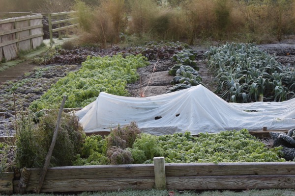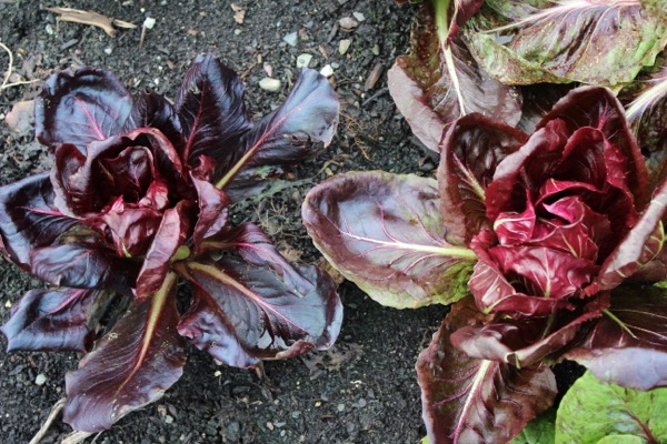 As long as the night temperatures have stayed above about -6c, chicories continue to look good and grow a little. Hearts are most vulnerable to frost and I harvested many just before, a few I covered with fleece, and all the less-hearted chicories are still outside, looking wonderful. They taste good too as long as you accept some bitterness, being which is plenty of flavour and sweetness too, especially in the Sugarloaf. it was sown July 14th and planted after broad bean.