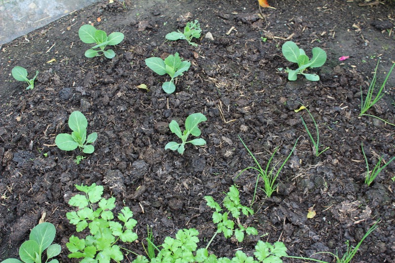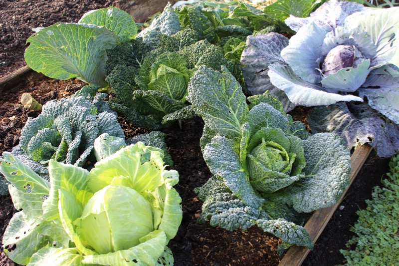 In the UK, sow broad beans asap if you are in the north, by early December in the south; plants want to be just a small size by Christmas, not too tall which would make them vulnerable to wind and frost. Likewise its good to have just medium rather than large overwintering cabbage and onion plants, see the photo.