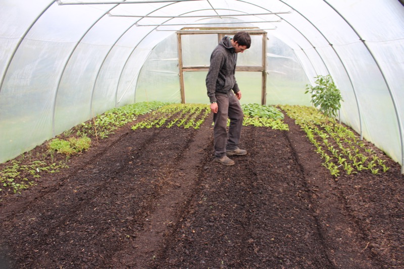 No dig means you can ignore many supposed rules, such as “you should not walk on beds”. So in the polytunnel, after pulling the substantial tomato plants on October 14th, we found it good to walk on the surface compost both to level and break up any lumps, before watering and planting salads for winter.