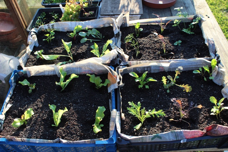 There is still just time to plant a container for salad leaves to pick from February to April. I suggest buying plants rather than sowing, although you can sow some fast-growing ones now such as leaf radish, mizuna and peas for shoots. I planted the boxes below on October 1st, from sowings on September 9th, and am taking them to the RHS show in London on November 1st. They are filled with multipurpose compost after lining with newspaper, and have been in the greenhouse.